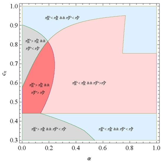 Proposition 6 implies that a Pareto zone exists where the platform firm and the IR prefer the marketplace model to the reselling model. The selling of remanufactured products cannibalizes the market of the new product; however, the platform firm would get some compensation when the IR sells more remanufactured products driven by a lower commission rate. In particular, under the case where all the products sold by the platform firm are remanufactured by the IR, the cost disadvantage of the new product is relatively low if the production cost of the new product is also low. As a result, the sale of the new product is large, and all products are remanufactured and resold by the IR via the platform. Therefore, the loss caused by the cannibalization effect is smaller than the corresponding gain. In this case, both the platform firm and the IR benefit more from the marketplace model than that of the reselling model. To understand the result presented in Proposition 6 better, we further provide Figure 2, where = 0.2 and θ = 0.9. α ranges from 0 to 1, while ranges from 0.3 to 1, as it should be greater than . As shown in Figure 2, firstly, the platform firm can always obtain higher profit under the reselling model with lower production costs for new products. The platform firm and the IR can always obtain higher profit under reselling model with higher production costs for new products. Secondly, the platform firm can always obtain higher profit under the marketplace model with moderate production costs for new products. Thirdly, we eventually find a region in which the commission rate is low, and the production cost of the new product is moderate. Thus, the platform firm and the IR can obtain a higher profit under the marketplace model in which the platform firm is the leader that is in line with Proposition 6.