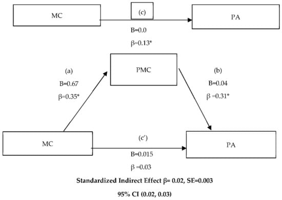 To determine whether PMC worked as a mediator variable between MC and PA, mediation analyses were carried out. The results showed that the effect of MC on PA was mediated by PMC (Figure 1). In the first regression equation (a), MC was positively related to PMC (β = 0.67; p = 0.000). In the second step (equation b) the regression coefficient of PMC on PA was significantly associated (β = 0.04; p = 0.000). In the last regression model (equation c), MC was positively associated with PA (β = 0.04; p = 0.000), but when PMC was included in the model (equation c’) the regression coefficient turned out to be non-significant and the relationship was eliminated (β = 0.03; p = 0.4855). Finally, the indirect effect was significant (indirect effect = 0.02) (95% CI; 0.02, 0.03), confirming the mediation role of PMC in this model.