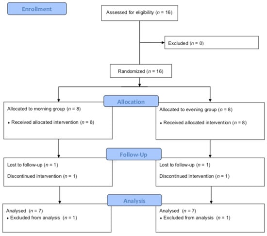 Fourteen female players completed the study and were included in the analyses, seven in the morning group (25.71 ± 3.90 years; 173.86 ± 6.47 cm) and seven in the evening group (22.71 ± 3.90 years; 169.43 ± 7.55 cm). Two participants (one in the morning group and one in the evening group) decided not to proceed with the intervention (Figure 1).