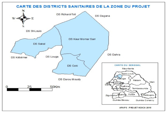The data collection was carried out in the Louga region, particularly in the communes of the project’s three target health districts, Coki, Keur Momar Sarr, and Sakal (Figure 1).
