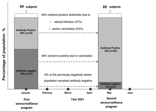 A serosurveillance program was conducted in the municipality of Deskati on 6 June 2021 to investigate the duration of antibody responses to SARS-CoV-2 infection and/or vaccination five months after an initial serosurveillance study [8] and nine months after the initiation of the pandemic wave in the area (October 2020). All the residents of Deskati who had been recruited to the first serosurveillance program (conducted in January 2021 [9]) were invited to participate in the follow-up program by the local authority and had been notified of the time and place thereof. Participants were recruited by announcing the research in the media while local officials organized a one-month recruitment campaign. There were no exclusion criteria. The participants were analyzed to evaluate seroprevalence and antibody-response longevity to SARS-CoV-2 infection and/or vaccination.