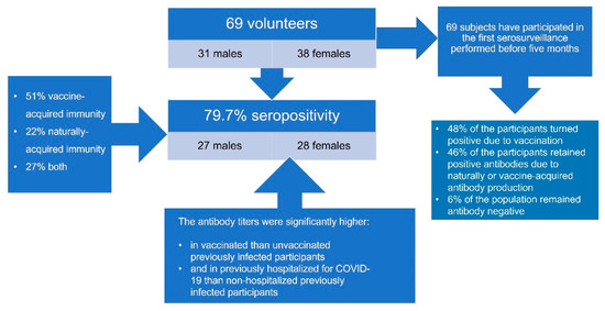 Antibody titers were significantly higher in previously infected and vaccinated individuals than previously infected, unvaccinated participants (8132 ± 6501 vs. 3615 ± 2203, p = 0.027). No difference was detected in antibody titers between uninfected vaccinated subjects and those previously infected but unvaccinated. Moreover, no age difference in antibody titers was detected among only vaccinated, only infected, or both vaccinated and infected populations. All previously infected participants tested positive for antibodies nine months after the initiation of the pandemic wave in the area (October 2020). Figure 2 presents the methodology and the main results of this study.