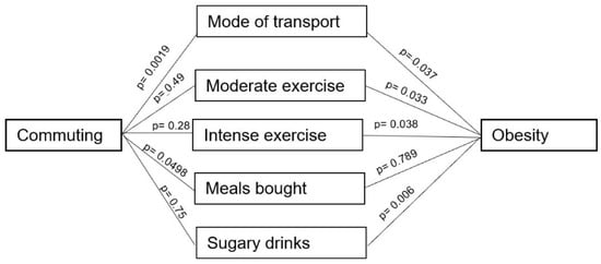 Obesity is not directly caused by time spent commuting, it is caused by the net positive caloric intake—calories consumed versus calories spent. Based on this, the above variables were investigated as possible mediators by which longer commute could be associated with obesity. Unfortunately, this study was of too low power to examine the mediation effects comprehensively. However, by using logistic regression and an arbitrary p cut off 0.25, five variables were identified to be investigated. This was possible given the assumption of 10 active cases required per variable investigated, and the frequency of obesity in this study being 36% required a sample size of at least 138. Using Hayes’ PROCESS v 5.5, the following relationships were determined in the pathway between commuting and obesity (Figure 1). The only significant pathway was that mediated by mode of transport. The effect was shown to be that with more active transport the risk for obesity decreased by 26% (−0.26, 95% CI −0.6689, −0.0169).