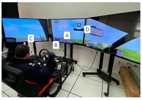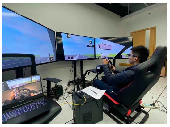 The driving simulation equipment combination was composed of a steering wheel, driving simulation seat, and three TV screens, which provided a comprehensive and scientific technical support for the design of the experiment and the analysis of subsequent data (Figure 1). These three screens could provide about 135° field of vision, creating a more realistic and three-dimensional driving experience. The rear-view mirror and instrument panel were also included. The simulation software platform can record more than 400 experimental parameters at the same time, including vehicle motion parameters, driver operation parameters, road environment parameters, traffic parameters, etc.