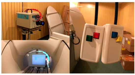 In order to enable the participant to receive the visual stimulation of the driving scene in the fMRI instrument, the projection board was suspended above the eyes, and the image was projected onto the board through mirror reflection so that the video image appeared in front of the participant’s line of sight. There were also two keyboards with four buttons in total, which were put in the hands of the participant for judgment, selection, and other behaviors in this experiment (Figure 4).