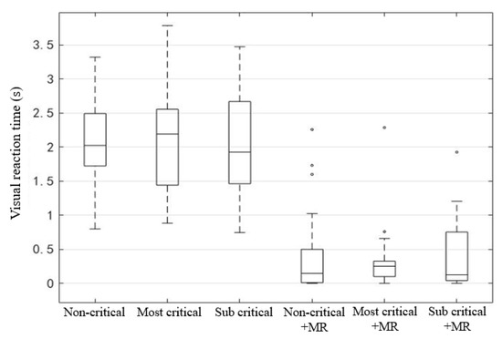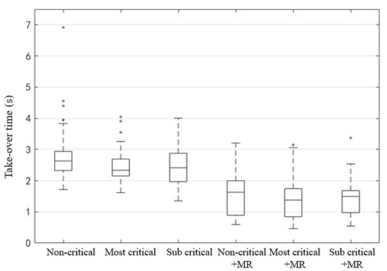 Takeover time refers to the time from the system issuing takeover request to the driver regaining the driving control of the vehicle. In this experiment, takeover time was recorded from the prompt of takeover request to the participant’s press of the takeover key. It can be seen that the takeover time with MR was generally less than that without MR (Figure 11). The takeover time with MR was between 0.4–3.4 s, while that without MR was between 1.3–4.0 s. The average takeover time of non-critical scenario without MR was the largest.