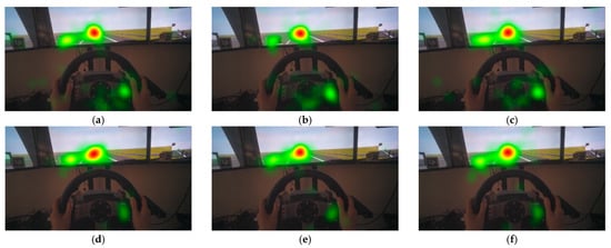 For the viewpoint thermal map, the greater the brightness of a specific point and the redder the color, the more attention the driver pays to the point. It can be seen that the participants’ viewpoints were mainly focused on the lead vehicle and the dashboard (Figure 8). For scenes without MR, participants paid more attention to the takeover button on the steering wheel, which may cause driving distraction. The MR can divert part of the attention on the takeover button to the lead vehicle and promote participants to better observe the situation ahead.