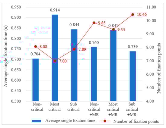 It was found that the total fixation duration of the front road area increased in all scenarios with MR compared to those without MR. This meant that since participants had fully observed the surrounding driving conditions during the pre-alert period, they could more calmly allocate more time to the road ahead after taking over, rather than observing everywhere aimlessly and in a panic (Table 5). Because they were more leisurely, participants in the scenarios with MR looked at the road ahead more often than those in the scenarios without MR, and because of the increase of points, the average single fixation time in some scenarios with MR decreased slightly (Figure 9).