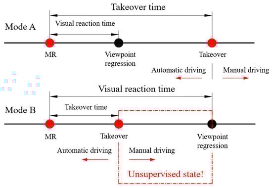 So, is the way of taking over dangerous? According to the sequence of viewpoint regression times and manual driving start times, take over mode can be divided into two types: (mode A) takeover driving manually after viewpoint regression, at this time, drivers or vehicles monitor and make decisions on the surrounding environment in the whole process of taking-over; (mode B) the viewpoint returns after taking over. There will be a dangerous period when neither the driver nor the vehicle system detects the surrounding environment (Figure 12 and Table 7). In scenarios without MR, that was, the participant was still in the secondary task state when receiving the takeover prompt, about 17.9%~25.6% of the participants took over the vehicle before viewpoint regression, while in scenarios with MR, less than 2.6% of the participants took over in mode B. This means that MR can make the driver’s viewpoint return in advance and earlier than the time of real takeover, so as to improve the safety of takeover.