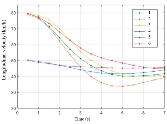The longitudinal average velocity can reflect the driver’s ability to control the vehicle speed after takeover and the dynamic performance of the vehicle in the longitudinal direction. Taking 0.5 s as the unit time interval, the average longitudinal speed change trend of drivers in 7 s after taking over the vehicle (starting from pressing the take-over button) was calculated (Figure 13). It can be seen from the figure that the starting speed of Scene 1 and Scene 4 (non-critical scenes) was 50 km/h, and the speed curve was smoother than other critical scenes. The starting speed of critical scenes was 80 km/h, and the braking and acceleration process of Scene 2 (most-critical scene without MR) was the most severe, and its speed fluctuation was the largest. All scenes generally reached the minimum speed within 4.5–5 s after taking over, and then the vehicle speed rose slowly.