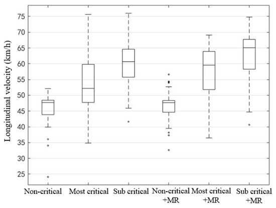 For the stage before the vehicle speed reached the minimum value, that is, the average longitudinal speed within 5 s after the driver took over, the box plot was drawn (Figure 14). Non-critical scenes have the most concentrated average speed distribution, while the speed distribution in most-critical scenes is the most dispersed, which indicates the increasing speed difference in a critical scene.
