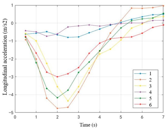 Similarly, take 0.5 s as the unit time interval, average longitudinal acceleration change in 7 s after taking over (starting from pressing the take-over button) was calculated (Figure 15). It can be seen that the acceleration of non-critical scenes was relatively stable. The longitudinal acceleration of other scenes had similar change trends, which could be roughly divided into three stages within 7 s: (1) the absolute value of deceleration increased gradually; (2) the absolute value of decreased gradually; (3) the acceleration or deceleration values tended to be stable. The acceleration change of the most-critical scene without MR was the most dramatic, while the acceleration change of the sub-critical scene with MR was the slowest.