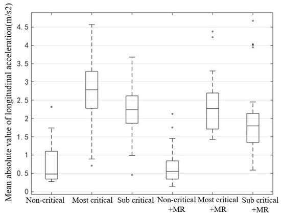 The absolute value of acceleration in the non-critical scenes was small, and the distribution was relatively concentrated (Figure 16). For other critical scenarios, the box chart of the most-critical scene is the longest, which indicates that the drivers’ choice of acceleration was the most dispersed and their driving behavior was not consistent, which may lead to the most complex speed change.
