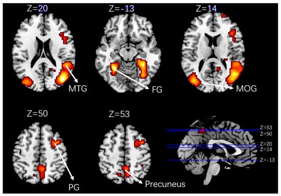 Under the stimulation of critical takeover scenario, five brain regions, including the middle occipital gyrus (MOG), fusiform gyrus (FG), middle temporal gyrus (MTG), precuneus and precentral are activated, which are related to cognitive behaviors such as visual cognition, distance perception, memory search, and movement association. Although the activation of the precentral gyrus (PG) related to movement is not consistent with the static experimental state, according to other fMRI studies, many scholars have found that the activation of the PG area is related to action planning, observation and the imagination of motor actions [22,23,24]. Therefore, it can be inferred that in the critical takeover scenario, drivers’ plans and the relevance of the action are stronger. At the same time, the results show that the non-critical takeover stimulation does not lead to additional significant activation areas compared with the critical takeover stimulation.