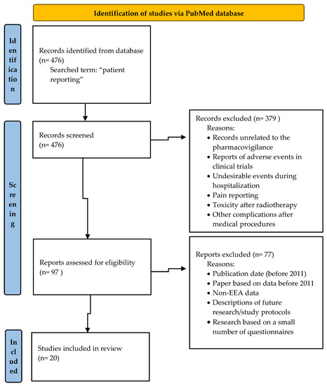 To review the scientific literature, the PubMed database was searched and “patient reporting” was the search term used. The selected studies were eligible for inclusion if they addressed patients’ reporting of ADRs and were related to the role of patient reporting in pharmacovigilance or the frequency of patient reports or were focused on factors influencing patient reporting of ADRs or the methods improving patients reporting. After an analysis of 476 searched titles, 97 records were originally eligible for inclusion. Based on the analysis of articles titles/abstracts, the records unrelated to the pharmacovigilance, reports of adverse events in clinical trials, undesirable events during hospitalization, pain reporting, toxicity after radiotherapy and complications after medical procedures were excluded. The articles published before 2011 were also excluded from the study. Figure 1 presents details of inclusion and exclusion criteria for the narrative literature review.
