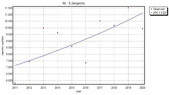 In 2011–2020 in the analyzed group, a relevant increase in the total of adverse reaction reports for all the substances under review was observed (APC = 5.02*). When analyzing individual groups of substances, an upward trend in an absolute number of reports submitted by healthcare specialists over the entire analyzed period was detected for: Naproxen APC = 10.18*; Dexketoprofen APC = 12.03*; Celecoxib APC = 4.62*; Etoricoxib APC = 7.16*. The observed rise was relevant for all the above-mentioned substances; however, the growth rate assessed by annual percent change indicated its diverse dynamics. The investigated substances also included the types whose trend in the observed period was not so unequivocal. The data concerning Ibuprofen, for instance, also demonstrated an increase in the recorded reports; however, it was relevant only in the initial period of the analysis, i.e., from 2011 to 2013, where APC = 31.47*, not from 2014 (APC = 2.90, p > 0.05). It should be emphasized that the year 2017 was a crucial point in the period under review, as it was in November 2017 that the obligation to report both serious adverse reactions and non-serious adverse reactions to the EudraVigilance database was implemented, which elevated the number of reports relevant, as a consequence. A relevant change in the trend of the overall number of reports made by healthcare professionals, which may result from the obligation to report also non-serious reactions to the database, was recorded for Lornoxicam, whose reports decreased relevantly since 2016 (APC = −16.33*), but increased since 2017 (APC = 3.76), albeit irrelevantly.