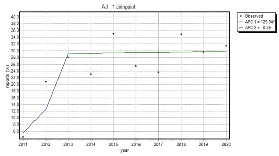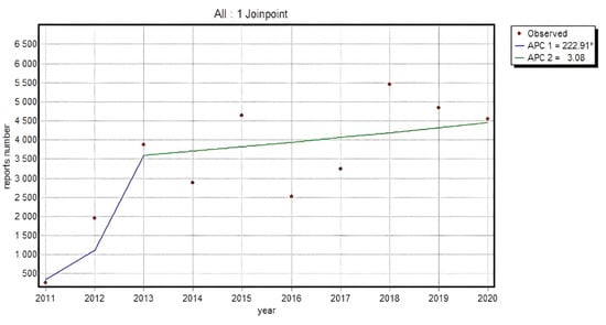 The time trend analysis was performed by means of a Joinpoint model. The method is an extended linear regression where the time trend is expressed as sections linked by the points in which the trend statistically significantly changes its direction. On the basis of the linear regression model, in which the natural logarithm of the number of ADRs for particular substances and the percentage of reports in non-HP group in all registered reports was the dependent variable, and the calendar year was the independent variable, the annual percent change (APC) and average annual percent change (AAPC) of the analyzed phenomenon were determined. To determine the statistical significance of APC and AAPC, the 95% confidence interval was determined (significance level was set at p = 0.05). The calculations were made with the Joinpoint Regression Program 3.5.2. (USA National Cancer Institute, Bethesda, MD, USA)—October 2011, recommended by the U.S. National Cancer Institute for this type of analysis.