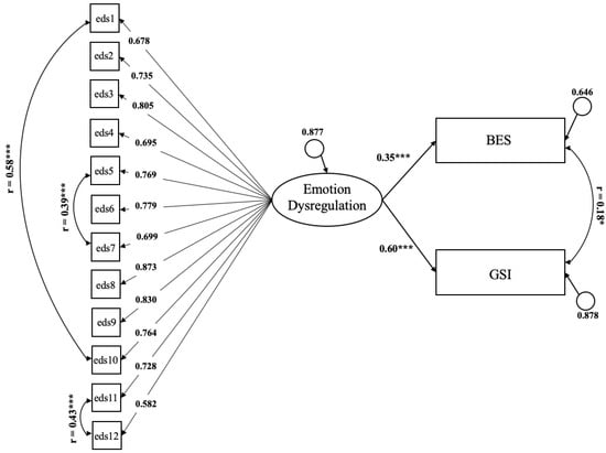 SEM Regression Analysis of the refined EDS-s with binge eating symptomatology (BES) and general psychopathology (GSI) as the dependent variables. * p < 0.05; *** p < 0.001.