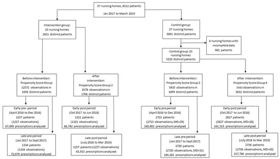 A quasi-experimental, controlled, multicentre, observational study in nursing homes belonging to a private healthcare group in France was performed on the period between April 2016 and April 2019. All nursing homes belonging to the Korian group were eligible for participation, which was on a voluntary basis. The Korian group is a French company specialised in providing long-term care services to older people. They provide a wide variety of housing solutions and services, with over 1000 facilities across 7 European countries. Nursing homes were included if they were using the same electronic pill dispensing system (Mono28®, Medissimo, Poissy, France) and would continue to do so throughout the planned duration of the study, had a medical director, collaborated with a community pharmacy for drug supply, volunteered to participate in the study and had all prescribing physicians and members of the Geriatric Coordination Committee agree to participate. The intervention group comprised volunteer nursing homes where the intervention (i.e., the collaborative therapeutic optimization program) was implemented, and the control group included nursing homes where the intervention was not implemented. Participating nursing homes were recruited from March to May 2017.