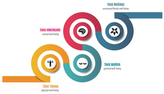 Both research methods help to enable a rich interpretation of the qualitative information provided by participants. The methods, one from Mātauranga Māori and the other from Western psychological research, align as both hold context to be an important factor, and both have been adopted in health research. Kingi [68] refers to this process as a means of facilitating the development of a conceptual framework, while Holloway and Todres [69] defend that ‘thematicising’ is a form of qualitative inquiry that can be conducted with several theoretical frameworks, including kaupapa Māori as reported by Ihimaera [70]. Based on a te ao Māori (traditional Māori worldview), four fundamental elements of health, namely, taha hinengaro (psychological), taha wairua (spiritual), taha tinana (physical) and taha Whānau (family), are used to help clustering groups of themes [71].