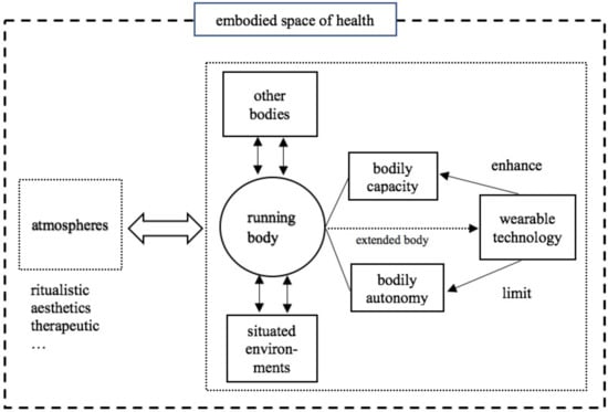 It has been widely recognised that running is an embodied and mobile practice that moves in/across space/place [4]; yet, how health subjects form and emerge from the interaction between body and space is largely under-theorised. Some research has revealed that health and well-being are not simply acquired through the management of medical body but also cultivated through the encounters with particular space/place, for instance, the therapeutic landscapes [10]. The importance of the concept of space/place in health studies is further acknowledged by the relational approach to health studies that draws upon the merits of actor-network theory [25]. This approach argues that effects of health “emerge from relationalities, interactions and assemblages of body/self, social discourses, more-than-human subjects, and the broader social-environmental setting” [26] (p. 1). Bearing this in mind, running is better understood as an embodied encounter between people and space/place [27]. In running, people and space are actually in “a mutually reinforcing and reciprocal relationship” [27] (p. 1825). For example, Little’s study of running in nature suggested that people’s intimacy with nature is integral to their project of self-caring, while the running practices in turn produce an authentic natural space that is emotionally perceived as health-promoted [4]. This paper therefore advances the relational and spatial approach to running and health by introducing the concept of what we call “embodied space of health.” There are at least three lines of insights that contribute to our theorisation of the “embodied space of health.”