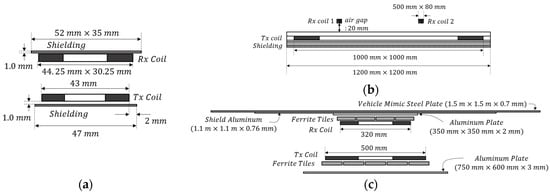 Three representative WPT systems that are widely used are selected and modeled in consideration of their physical size and power level. Figure 1 illustrates the geometry of the three WPT systems considered in this study. The first is a 5 W class phone wireless charging system using a 111 kHz resonance frequency. Transmitting (TX) and receiving (RX) systems are designed based on TX A 10 and RX example 1 model, respectively, provided in Qi-standard [18]. The TX coil is a circular coil with an outer diameter of 43 mm, and the RX coil is a rectangular coil with an outer width of 44.25 mm × 30.25 mm. The modeling of the WPT systems for phones is satisfies the specifications in the standard. The second system is a WPT system for drones, operating at a resonance frequency of 140 kHz with a TX power of 200 W. The sizes of the TX and RX coils are 1000 mm × 1000 mm and 500 mm × 80 mm, respectively. The modeling of the system is confirmed by comparing electrical specifications and EMFs through simulations and experiments [10]. The last is an electric vehicle wireless charging system with a TX power of 7.7 kW. This is the WPT2/Z2 class circular system defined in the society of automotive engineers (SAE) standard, and it consists of a ground assembly and vehicle assembly corresponding to TX and RX, respectively, and a vehicle steel plate [19]. The TX and RX coils are quasi-square of 500 mm and 320 mm size, respectively, and, unlike other systems, 1.1 m × 1.1 m shield aluminum and 1.5 m × 1.5 m vehicle mimic steel plate are included. The modeling verifies that the design is accurate by satisfying the electrical specifications presented in the standard.