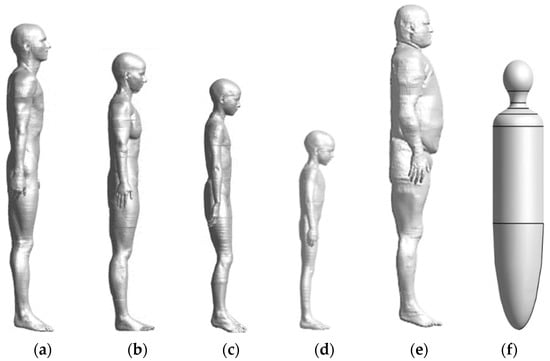 Five anatomical models and a simplified model, shown in Figure 2, are considered in this study. The five anatomical models are the virtual population models from information technologies in society (IT’IS) and the tissue properties of the IT’IS database are used [20,21,22]. The names and characteristics of each model are as follows: Duke (a 34-year-old male, with a body mass index (BMI) of 22.4 kg/m2), Ella (a 26-year-old female, with a BMI of 21.6 kg/m2), Billie (an 11-year-old female, with a BMI of 15.3 kg/m2), Thelonious (a 6-year-old male, with a BMI of 13.8 kg/m2), and Fats (a 37-year-old male, with a BMI of 36 kg/m2). A simplified model is a homogeneous human body model, introduced in the IEC standard, with two-thirds of the dielectric constant of the muscle at each operating frequency is used [23,24].