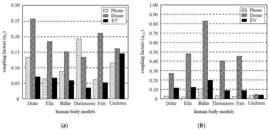 Figure 4 shows the change in coupling factors depending on the percentile when J and E of each percentile are applied instead of Jmax and Emax in (1) and (2), respectively. In the case of ac, all the human body models show a relatively similar tendency depending on the percentile in phone and drone systems, but the uniform model is calculated particularly large in the EV system. This is because the EV is installed on the ground, the Jmax occurs at the ankle of the anatomical models, which is smaller R compared to the torso of the uniform model. On the other hand, in the case of ac1, as Emax appeared in the armpits and toes, a difference of up to about 4.4 times occurred between the anatomical models, and a difference of up to about 17.6 times occurred compared with the uniform model.