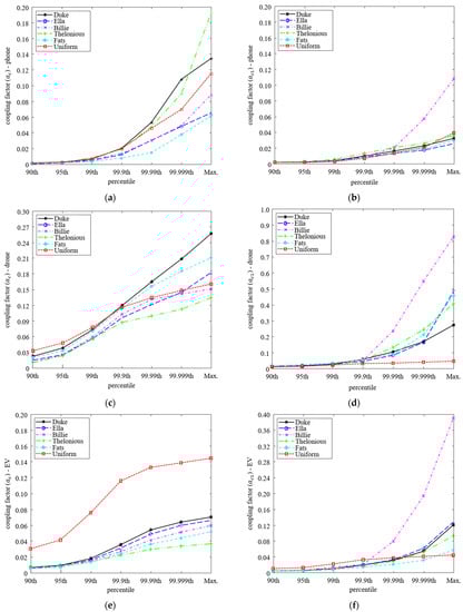 Comparison of coupling factors depending on percentile (a) ac,phone, (b) ac1,phone, (c) ac,drone, (d) ac1,drone, (e) ac,EV, and (f) ac1,EV.