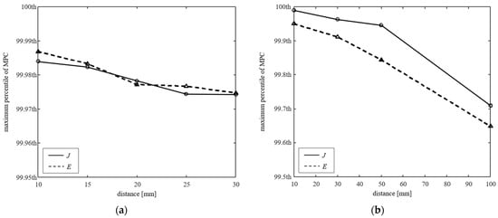 Figure 5 shows the maximum percentile of the MPCs according to the distance of the phone and drone systems. This is the maximum percentile that is not estimated to be less than MPCtier4 when applied to Jth or Eth in Equations (14) and (15), respectively. As the distance increases, the MPCs also decreases, because the H-field ratio decreases. When the system is close to the human body, it may be underestimation rather than tier 4 if peaks are removed under 99.99th percentile, and further peaks can be removed as the system is farther away.