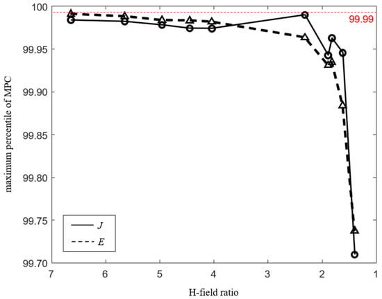 Figure 6 shows the aggregated results of the maximum percentile of MPCs according to the H-field ratio for all systems. Since the H-field ratio increases as the distance between the WPT system and the human body model decreases, the x-axis is shown in the direction in which the distance increases, that is, in which the H-field ratio decreases. As the distance increases, the maximum percentile also decreases according to the decreasing H-field ratio. The 99.99th percentile is suitable for conservative evaluation regardless of the distance, and the percentile can be determined according to the H-field ratio for the uniform assessment regardless of the human body model.