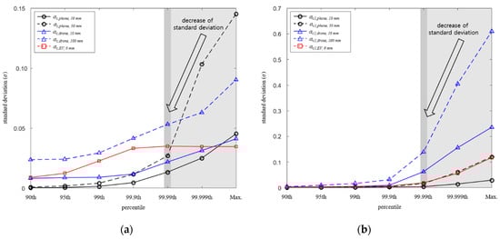 Standard deviations depending on the percentiles. (a) ac and (b) ac1.