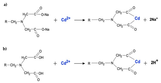 Iminodiacetic acid is the functional group of resin and the mechanism of chelating of cadmium by the (a) Na form and (b) H form.