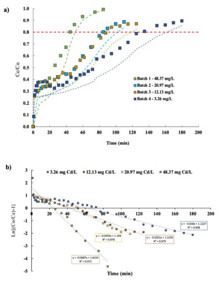 With respect to the adsorption capacity, Sasaki et al. [] obtained an estimated value of maximum capacity of 0.3 mg g−1 for a fish sauce with a cadmium concentration of 300 mg L−1 and a flow rate of 5 mL h−1 with chelate resin as the adsorbent according to their experimental results. Xiong and Yao [] achieved a maximum capacity of 349 mg g−1; however, different conditions of cadmium concentration (200 mg L−1), influent flow rate, and type of eluted sample were used.