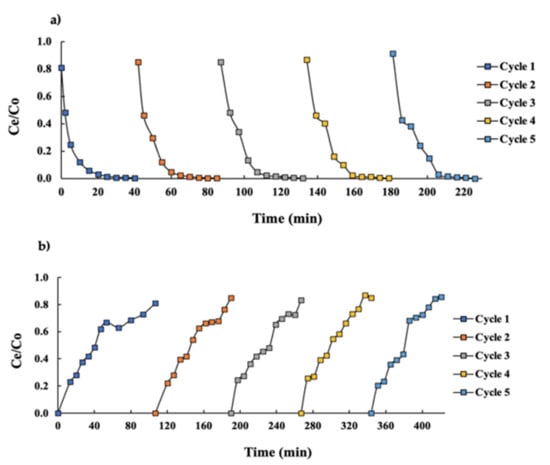The sequence of desorption–regeneration followed by a wash was considered one cycle. The evaluation of the adsorbent reusability was conducted after five repeated cycles. The saturation points and desorption curves of each cycle were evaluated using the relation Ce/C0 as a function of time (min). Additionally, each cycle was evaluated using the Thomas model and the total capacity of cadmium adsorption was determined as described in Section 2.3.1 and Section 2.3.2.