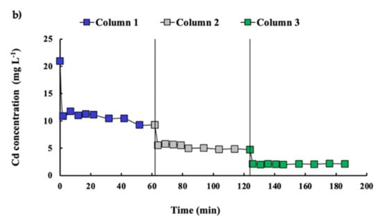 (a) Schematic representation of the three columns connected in series. (b) cadmium concentration performed in the column assay connected in series. The initial cadmium concentration in column 1 was 20.97 mg L−1. The final concentration of one column was the inlet concentration of the next column. The final concentration was 2.10 mg L−1.
