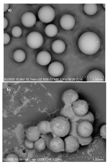 On the other hand, solids also blocked the binding sites and could form a kind of fouling on the saturated resin. Figure 6 shows the SEM images captured before and after the adsorption process. Before the adsorption process, a spherically shaped resin with an average diameter of 560 µm, a uniform morphology, and a smooth surface was observed (Figure 6a). After the total adsorption process, the resin was coated with a film consisting of white spots, which was attributable to the presence of inorganic material, and a layer of lipid material on the surface of the resin (Figure 6b). Calderon et al. [] showed that in a batch study, 44.9% of the fat content from GSH remained in resin after an adsorption treatment, meaning losses on the adsorption capacity of the resin and a faster resin saturation. In contrast, the use of adsorption fixed-bed columns connected in series allowed us to treat the GSH more efficiently despite the lipid layer coating the resin. In this regard, the presence of undesirable compounds in the adsorption process for cadmium removal, such as other metals, salts, and fat content, interfered with and blocked the binding sites of the resin.