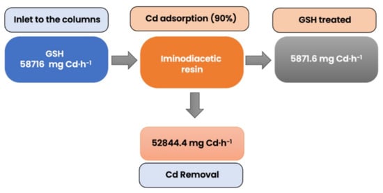 Representation of the mass balance of cadmium removal from GSH by columns in series with 90% cadmium removal at an industrial scale. The simulation consisted of GSH with a Cadmium concentration at the inlet of 20.97 mg L−1, pH of 6.20, a flow rate of GSH of 2800 L h−1, and a resin content of 140 kg per column.