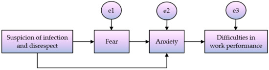 The path from experience of verbal abuse (suspicion of infection and disrespect) to fear was positively significant (β = 0.181, p = 0.003), and the path from experience of verbal violence (suspicion of infection and disrespect) to anxiety was also positively significant (β = 0.111, p = 0.041). The path from fear to anxiety was positively significant (β = 0.475, p < 0.001), and the path from anxiety to difficulties in work performance was also positively significant (β = 0.372, p < 0.001). Altogether, these findings suggested that more experiences of verbal violence (suspicion of infection and disrespect) are associated with greater fear and anxiety, that higher fear leads to higher anxiety, and that higher fear causes greater difficulties in work performance (Table 2).