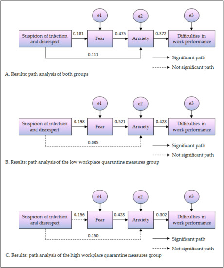 Result of path analysis. (A) Results: path analysis of both groups. (B) Results: path analysis of the low workplace quarantine measures qroup. (C) Results: path analysis of the high workplace quarantine measures group.