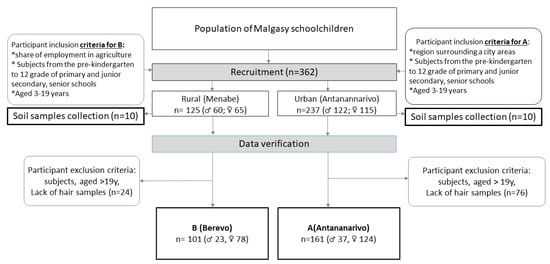 The study subjects were recruited (A) close to the capital—Antananarivo—on the east of Madagascar and (B) close to Berevo, on the west of Madagascar, from Menabe regions. Subjects numbering 161 (37 ♂ and 124 ♀) in the A region were enrolled in the study (38 from the center of Antananrivo, 62 from suburban area–Ambohidratrimo—and 61 from the close village Ambatomasina). In the B region, 101 subjects (23 ♂ and 78 ♀) from a school run by a Catholic mission were qualified for the study. At schools in the A region, children and adolescent from the capital and suburban area participated in a feeding program financed by non-governmental organisations.