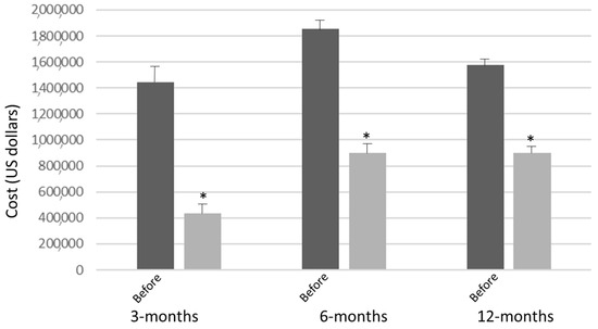 Of the 84 participants enrolled, 49 were followed for 12 months and had their respective cost savings in regard to hospitalizations after enrollment in Together In Care analyzed. At the 3-month mark of enrollment, of the 49 participants, 48 were hospitalized, with total hospital expenditures being $435,258 ± 113,423 as compared to $1,445,637 ± 325,433 (p < 0.01) of their cost during the 3 months prior to enrollment (Figure 1). At the 6-month mark of enrollment, of the 49 participants, 42 experienced hospitalizations between months 3 to 6, with total hospital expenditures (all 6 months) being $899,106 ± 243,987 as compared to $1,853,406 ± 477,586 (p < 0.01) of their cost during the 6 months prior to enrollment. At the 12-month mark of enrollment, of the 49 participants, 17 experience hospitalizations between months 6 to 12, with total hospital expenditures (all 12 months) being $901,382 ± 375,588 as compared to $1,575,947 ± 273,444 (p = 0.04) of their cost during the 12 months prior to enrollment (Figure 1).