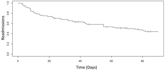 Kaplan–Meier curve for 3-month readmissions of the 84 participants, with censoring provided for the 10 patients who passed away.