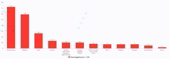 Poor health was highlighted by most participants, with ongoing health issues present amongst 90% of participants. Although varied, the main issues were mental illness (72%) and addiction (69%) (Figure 1). Furthermore, self-reported reading ability was found to be poor across the population as 30% of participants reported low confidence in their reading ability and almost one-fifth (18%) reported no confidence at all. Approximately 25% of the participants required some assistance when completing the questionnaire. There was a gender difference in self-reported reading confidence with 72 male participants reporting greater confidence (M = 3.12, SD = 1.41) than the 28 female participants (M = 2.75, SD = 1.40), and this was found to be statistically significant, t(97) = 3.087, p = 0.003.