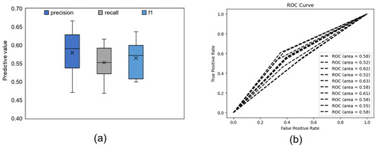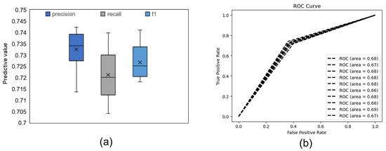 Predictive results of the FER model. (a) Each box shows the distribution of the predictive results of ten test sets. The black line in the middle of each box indicates the median; “×” indicates the mean value. (b) ROC curve of ten test sets.