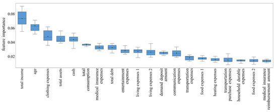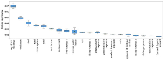 We then explained the constructed models by examining the information gain of features (calculating feature importance) [51]. The feature importance of the FER and FVR models is presented in Figure 3 and Figure 4, respectively. Since tenfold cross-validation technology was used to evaluate our models, the feature importance was different when predicting different test sets. Therefore, the distribution of feature importance was arranged in descending order of the mean value, and only the top 20 features were included for visibility. We observed that for the FER model, the most important feature is a registered residence, accounting for 6.98% of the model. Total assets are the second most important feature (4.93%), followed by funds (4.07%), total consumption (3.66%), rural areas (3.50%), total income (3.05%), stock accounts (2.75%), and so on. For the FVR model, the total income is the most important feature (7.34%), followed by age (6.33%), clothing expenses (4.82%), total assets (4.46%), cash (4.39%), and total consumption (3.67%). The above results compare the potential impact of different features on fraud exposure and fraud victimization, and the complete importance scores are presented in supplementary material Tables S2 and S3.