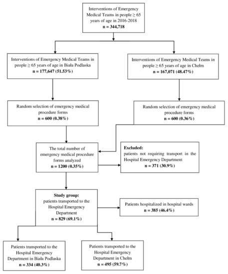 We analysed medical records of 1200 older patients (≥65 years) treated by METs from Biała Podlaska (600 sheets of medical records) and Chełm (600 sheets of medical records) in the Lublin Province (Poland). Although the emergency request forms were selected randomly, age ≥ 65 years was the main inclusion criterion. We analysed 2016–2018 data. We analysed 400 sheets of medical records in a year (200 sheets from a given county). The analyses covered 12 consecutive months of the year, which gave about 17 forms per month.