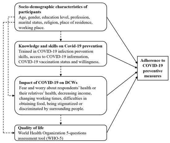 Factors considered to be possibly related to adherence to preventive measures included socio-demographic characteristics, knowledge, and skills on COVID-19 prevention, and the impact of COVID-19 on the lives of DCWs (Figure 1).