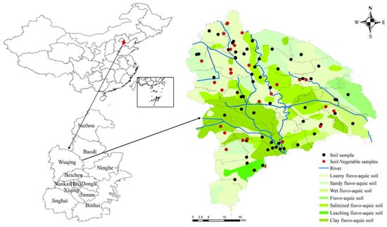 The study area is in Wuqing, northwestern Tianjin (116°46′–117°19′ E, 39°07′–39°42′ N), which is located in the lower part of the North China alluvial plain, with a gentle terrain and a total area of 1574 km2. The region features a temperate continental monsoon climate, with an annual average temperature of 11.6 °C, and an annual rainfall of 500–610 mm. Northwest winds are prevailing throughout the year, and annual average wind speeds are about 2–4 m·s−1. There are abundant high-quality coal reserves in the northwestern of Wuqing. The area also has many industrial parks, including industry, material manufacturing, automobile parts industry, and steel industry. It is also one of the main vegetable production areas in Tianjin city. Soil types in the area include fluvo-aquic soil, loam fluvo-aquic soil, sandy fluvo-aquic soil, clay fluvo-aquic soil, salinized fluvo-aquic soil, humid fluvo-aquic soil, and limestone leaching fluvo-aquic soil in terms of the classification and codes for Chinese soil (GB/T17296-2009). As a typical urban fringe area, the agriculture, industry, transportation, and other human activities in Wuqing District have changed significantly during the past decades. Thus, the characteristics of HM pollution sources in farmland are complex, seriously threatening the sustainable use of regional agricultural resources and the safety of agricultural products.