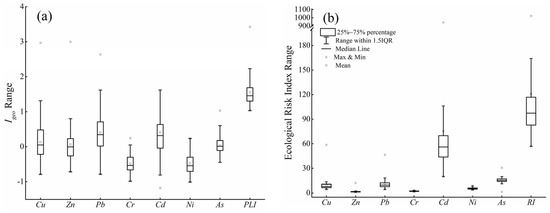Geo-accumulation index (, a) and ecological risk index (b) of HMs.